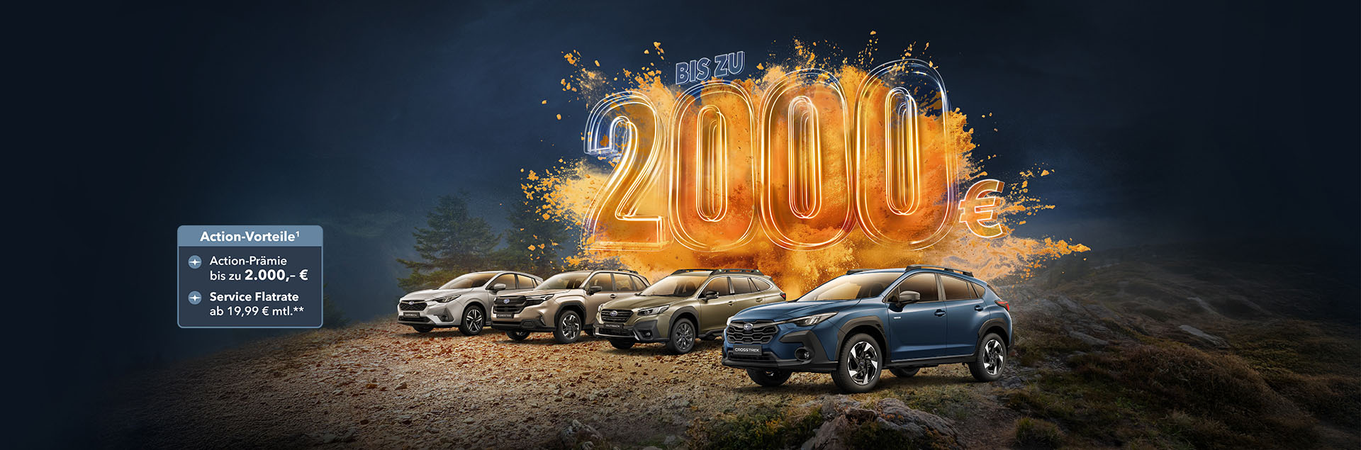 1 Die Aktion gilt vom 01.04.2026 bis 30.06.2026 in Verbindung mit dem Kauf eines aktuellen Subaru Impreza, Crosstrek, Outback oder Forester (Neu- oder Vorführwagen), Zulassung/Besitzumschreibung bis 30.09.2026 bei teilnehmenden Subaru Partnern. Die Aktion wird gemeinsam von der SUBARU Deutschland GmbH und den teilnehmenden Subaru-Partnern getragen und ist nicht mit anderen Aktionen der SUBARU Deutschland GmbH kombinierbar mit Ausnahme des Aktionsangebots zur Service-Flatrate. Sie sparen je nach Modell bei Kauf eines Subaru Crosstrek oder Impreza (MJ 2024): 2.000,-€, eines Crosstrek oder Impreza (MJ 2025/2026): 1.500,-€, eines Outback (MJ 2024/2025): 1.000,-€ oder eines Forester (ab MJ 2025): 1.500,-€. Weitere Detailinformationen erhalten Sie bei Ihrem teilnehmenden Subaru Partner oder unter www.subaru.de.